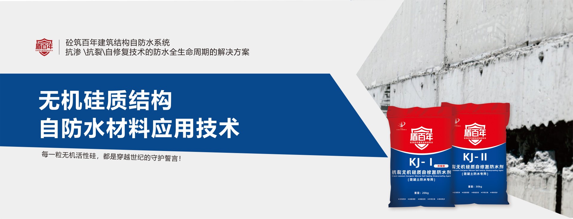 产品性能:盾百年抗裂硅质结晶防水剂KJ-B类(通用型)混凝土专用是本公司吸收国外先进技术的基础上自主研发的高新技术产品,是掺和在混凝土、砂浆中使用的专用防水材料,具有促进水泥粒子界面活性和优越的防水性能,...